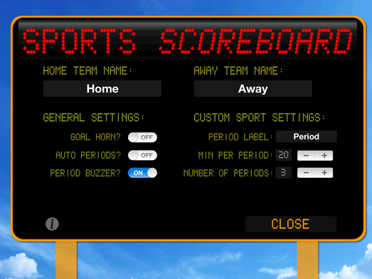 - Multiple sports – choose from Hockey, Football or Basketball. Or create your own Custom sport.